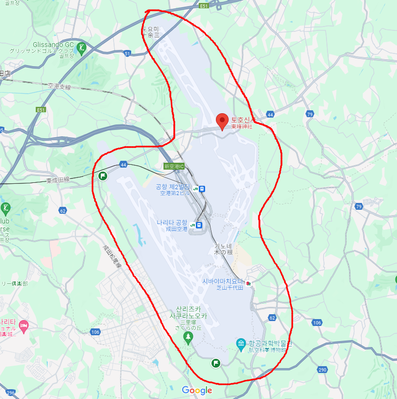 위의 지도가 확대된 모습이고 아래의 모습은 나리타공항 전체의 모습중 신사의 위치를 보여주는 지도입니다.