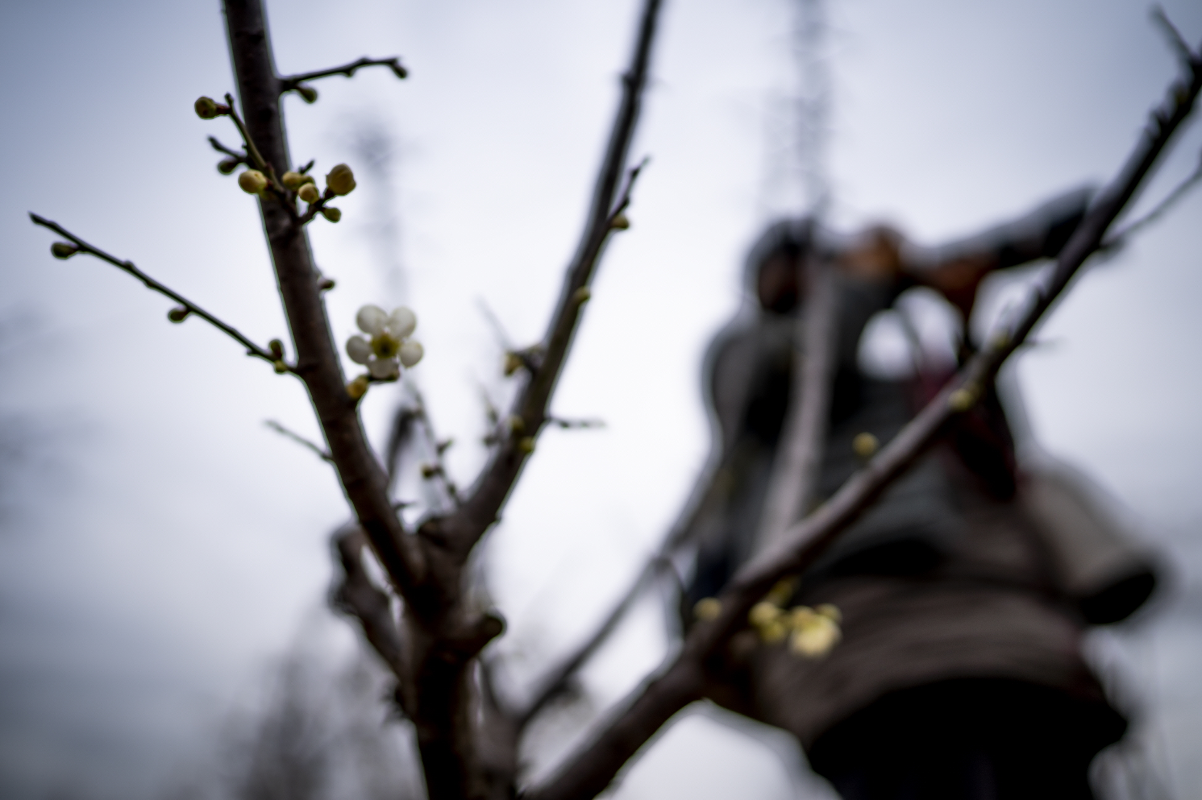 미녀와 야수라고 할까요? 뒤에 보이는 홍매화를 어디에도 못가게 감시하고 있습니다.