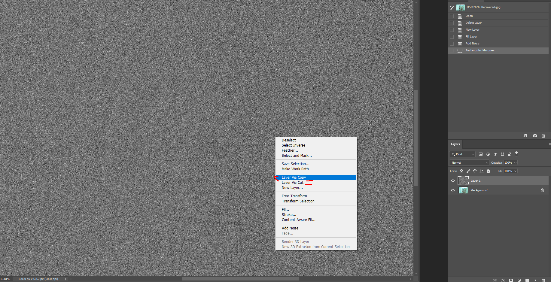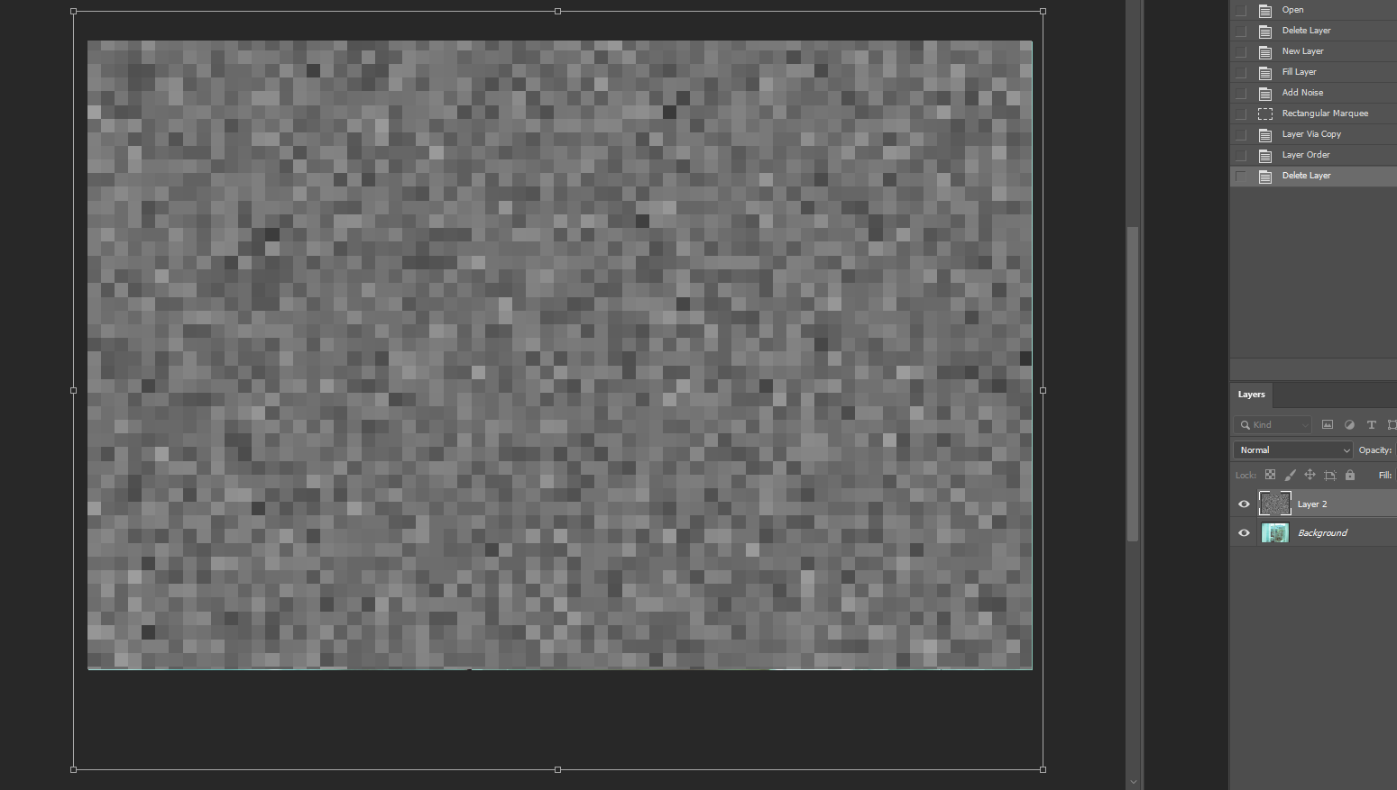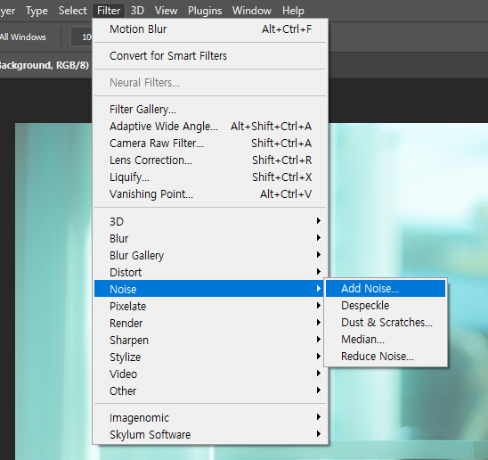 덮여진 레이어1 을 선택한 후 Filter-Noise(노이즈) - Add noise(애드 노이즈) 를 선택합니다.