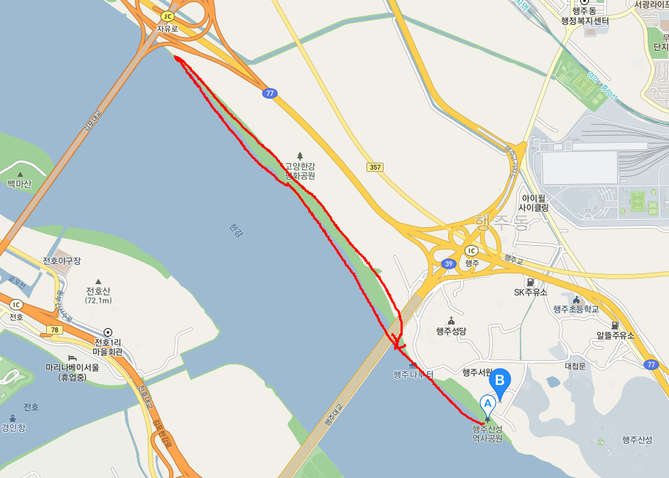 아래 지도처럼 행주산성 역사공원에서 김포대교까지 갔다 오는 코스입니다.