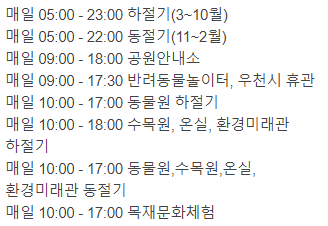 보통 대공원의 오픈시간은 새벽 5시 폐장시간은 밤 11시입니다. 장소별 시간제한도 있으니 아래 참고하세요.