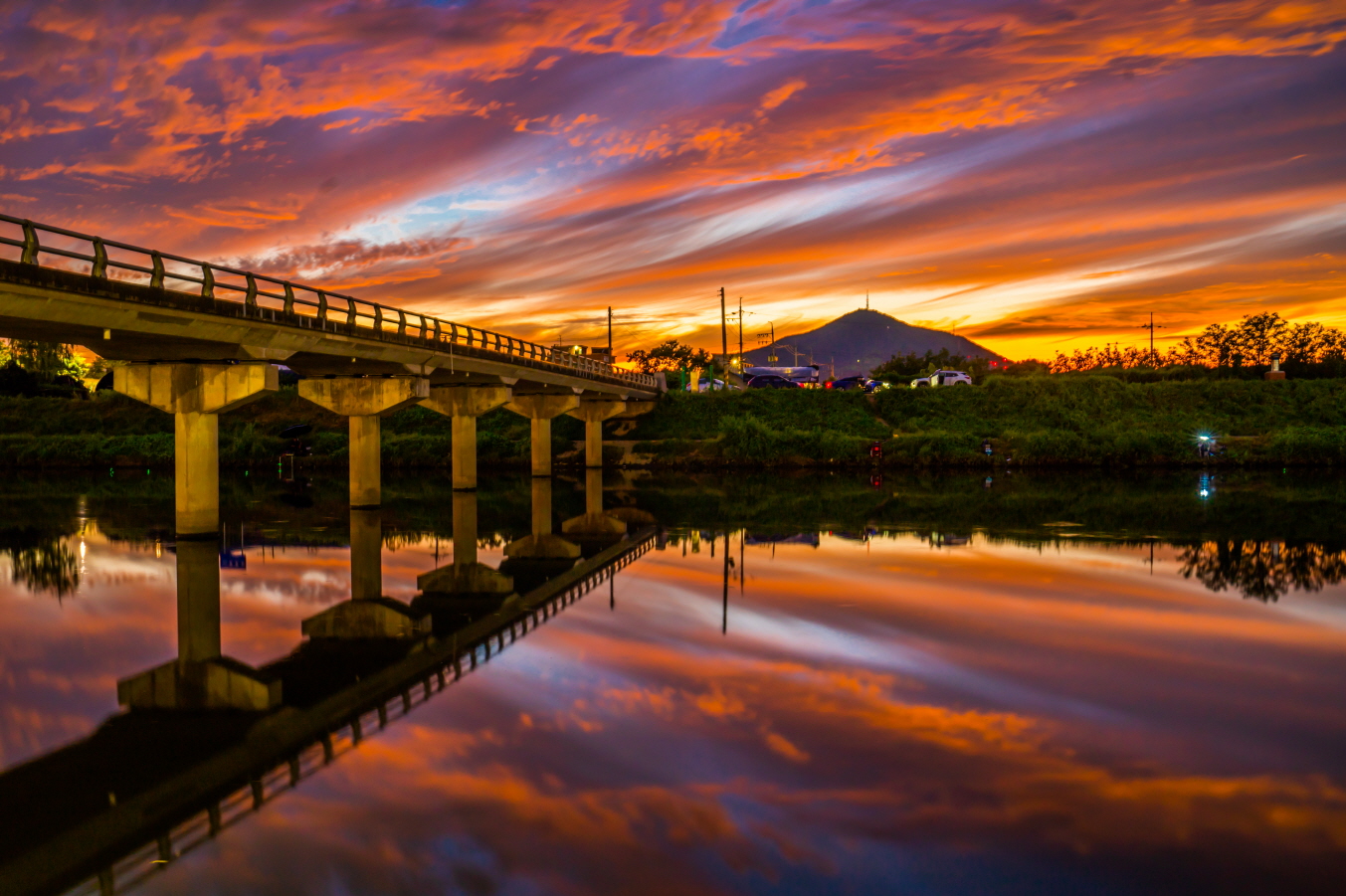 다리 위로 비쳐진 모습이 저 계양산까지 이어져 있는 것 같습니다.