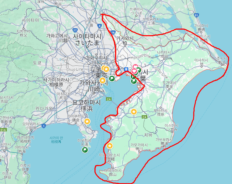 일본 치바는 상당히 큰 편이다. 왼쪽은 도쿄 오른쪽은 치바 영역을 표시했다.